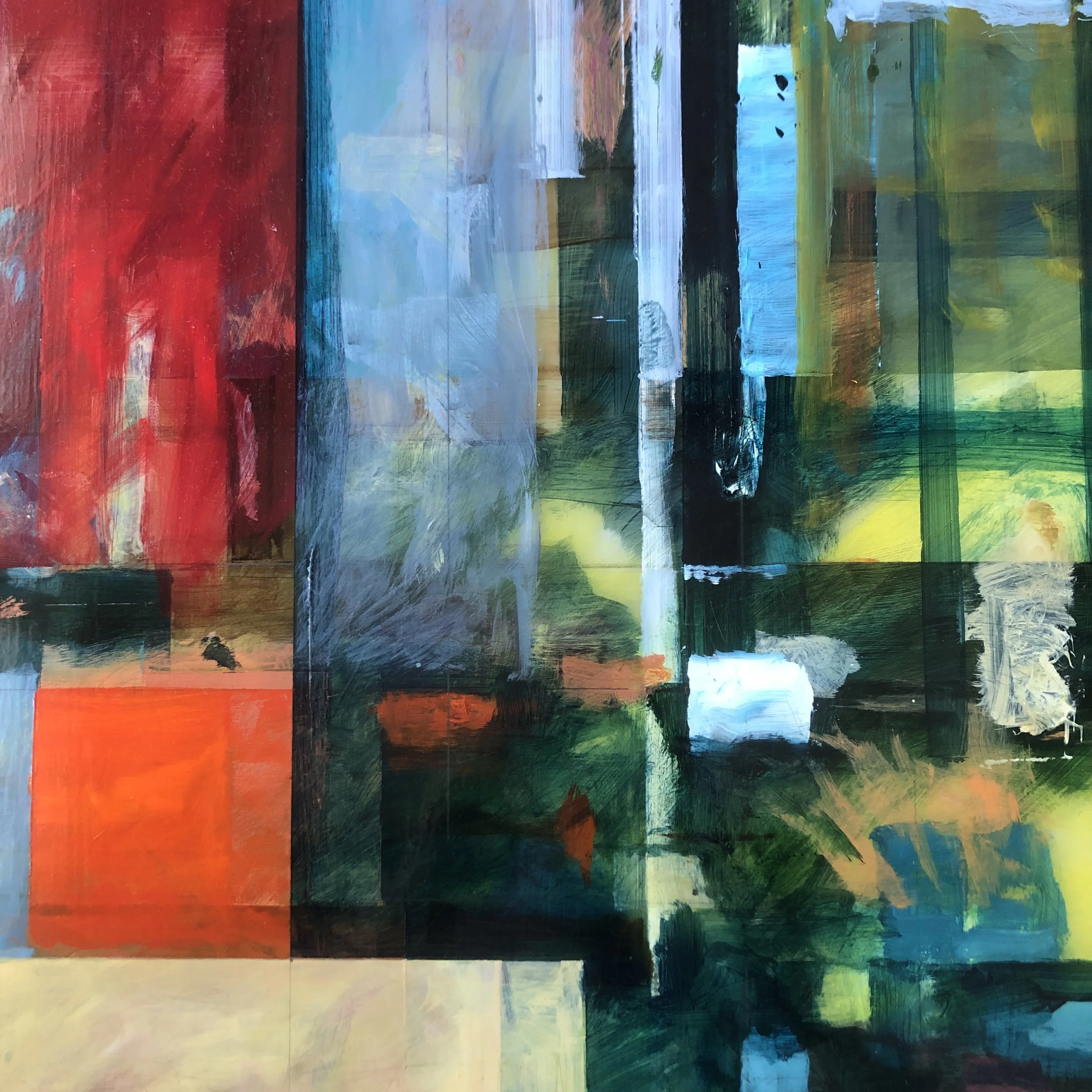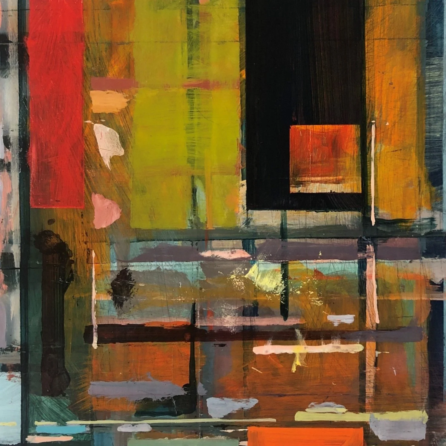 Developed as ‘excerpts’ of urban landscapes, Barry employs techniques of both accumulation and erasure to transform the translucent surfaces of the paintings in a layered process. His intuitive use of classical under-painting with complementary colors in the background creates a vibrancy and depth of surface, scored with architectural linework reflective of underlying geometries and profiles. Reciprocal sanding and rebuilding of pigments alters the surface while revealing apparent aspects of earlier figures. As a counterpoint, the mylar studies present investigations of discrete conditions or ‘moments,’ constructed of overlapping washes and latent lines, an additive process applied in translucent veils.